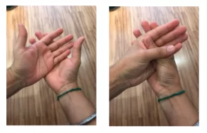 apontam para cima em um ângulo confortável. Neste caso, não faz diferença qual palma (direita ou esquerda) ou dedo polegar fica por cima.
